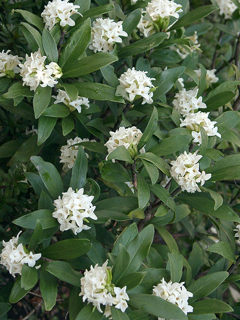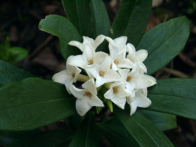 原産地は中国南部で、日本では室町時代頃にはすでに栽培されていたとされる。常緑の低木で、葉は月桂樹の葉に似ている。2月末〜3月に、枝の先に20ほどの小さな花が手毬状に固まって咲く。花を囲むように葉が放射状につく。花は強い芳香を放つ。 (撮影:03-3-26) |