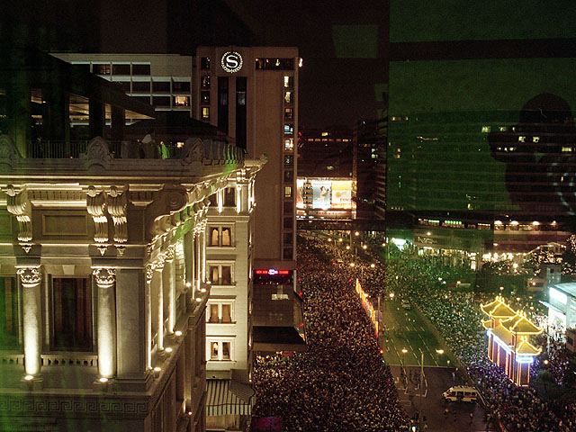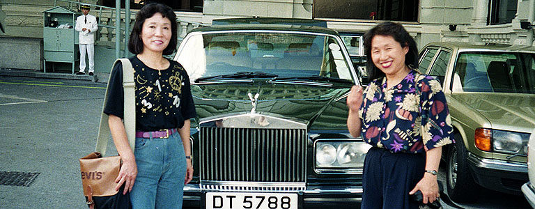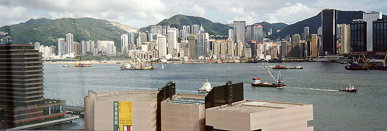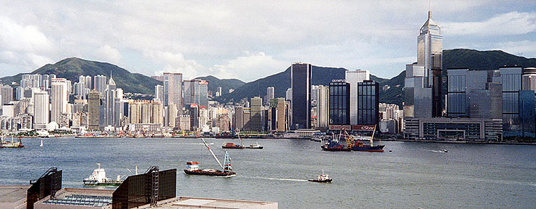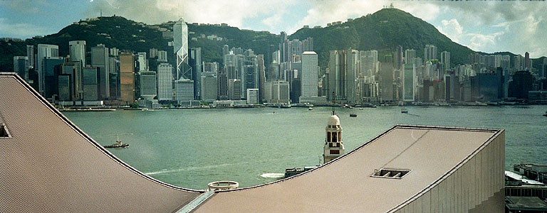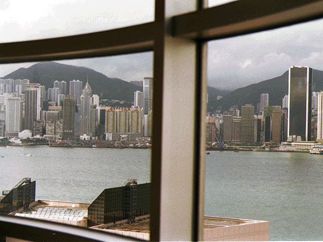 YMCAの隣はペニンシュラホテル その向こうにシェラトンホテルも見えます YMCA宿泊中に何度かペニンシュラにも食事などで行きました (←これは97年香港返還式典の時の写真) |