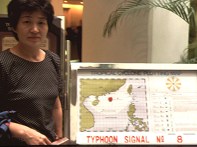最終日、台風が接近。ホテルロビーに、「シグナル8」 (烈風あるいは暴風シグナル)発令の表示が。帰国できるか不安。 |